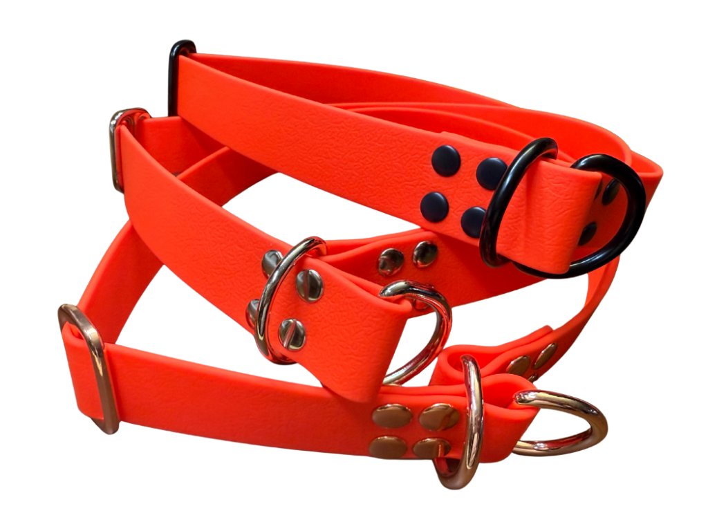 Stahovací obojky vyrábíme o 5 cm větší než je maximální uvedená velikost, aby šly pohodlně přetáhnout přes hlavu. Například: pokud má váš pes obvod krku 40 cm, zvolte velikost M (34-45 cm), celkový obvod obojku bude 50 cm.